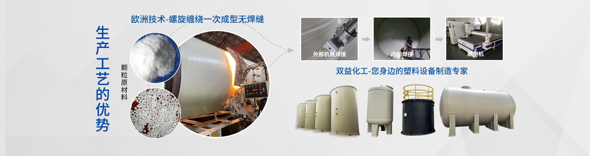 太倉(cāng)市雙益化工防腐設(shè)備有限公司坐落于美麗的江南水鄉(xiāng)古鎮(zhèn)-江蘇太倉(cāng)市沙溪鎮(zhèn),南靠上海,距上海虹橋機(jī)場(chǎng)50公里,西鄰蘇州70公里。公司引進(jìn)歐洲先進(jìn)技術(shù)-擠出纏繞無(wú)焊縫機(jī)組,自動(dòng)化焊接技術(shù)及生產(chǎn)裝備,保證了大型塑料設(shè)備加工的質(zhì)量和精度,1500噸大型塑料封頭注塑機(jī),實(shí)現(xiàn)了從主體到附件,完全用同牌號(hào)材料加工制作而成??筛鶕?jù)需要儲(chǔ)存的介質(zhì)的性質(zhì)和溫度選擇進(jìn)口或國(guó)產(chǎn)原材料來(lái)生產(chǎn)不同系列等級(jí)的各種大型PP儲(chǔ)罐,PPH儲(chǔ)罐,PP攪拌罐,PP真空計(jì)量罐,聚丙烯反應(yīng)釜,聚丙烯酸洗槽,塔器(洗滌塔,吸收塔,中和塔,脫味塔)等塑料防腐設(shè)備。